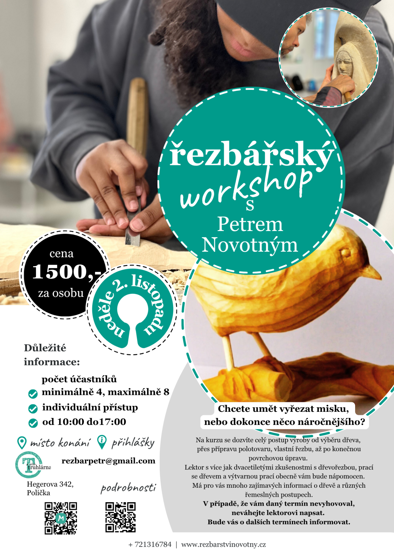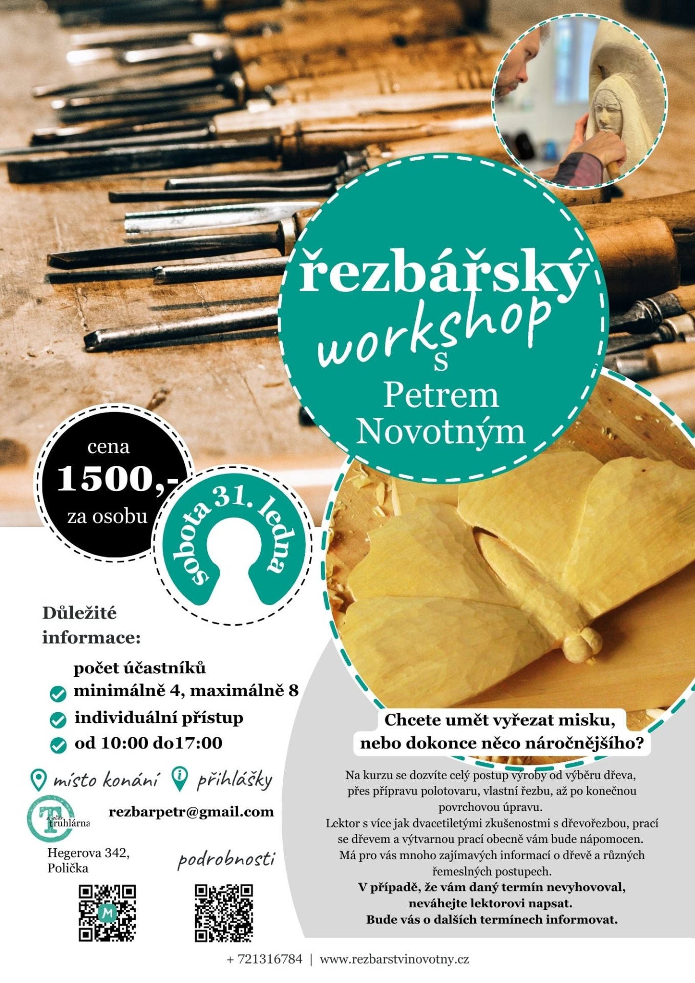 Na kurzu se dozvíte celý postup výroby od výběru dřeva, přes přípravu polotovaru, vlastní řezbu, až po konečnou povrchovou úpravu. Rád se s Vámi podělím o více jak dvacetileté zkušenosti s dřevořezbou, prací se dřevem a výtvarnou prací obecně. Mám pro Vás mnoho zajímavých informací o dřevě a různých řemelsných postupech. Dám Vám tip na nákup vhodného nářadí a další praktické rady, které Vám pomohou v další tvorbě. Kurz sice není přímo zaměřen na výtvarnou stránku, i přes to si poslechnete mnoho užitečných rad ohledně nákresů, uměleckých postupů....